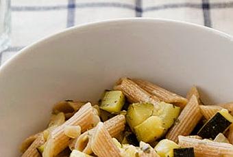 Ingredientes:- 200 gramos de macarrones integrales.- 1 cebolla.- 1 calabacin grande.- 1 diente de ajo.- Aceite de oliva virgen extra.- Sal.- 60 ml de vino blanco.- Perejil.