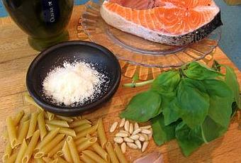 Macarrones integrales con salmón fresco y pesto de albahaca.