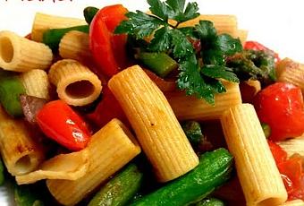 Macarrones integrales.Espárragos trigueros (Congelados).Setas variadas.Tomates Cherry.Aceite de Oliva.Pastilla de caldo de Verduras.Sazonador de pasta.