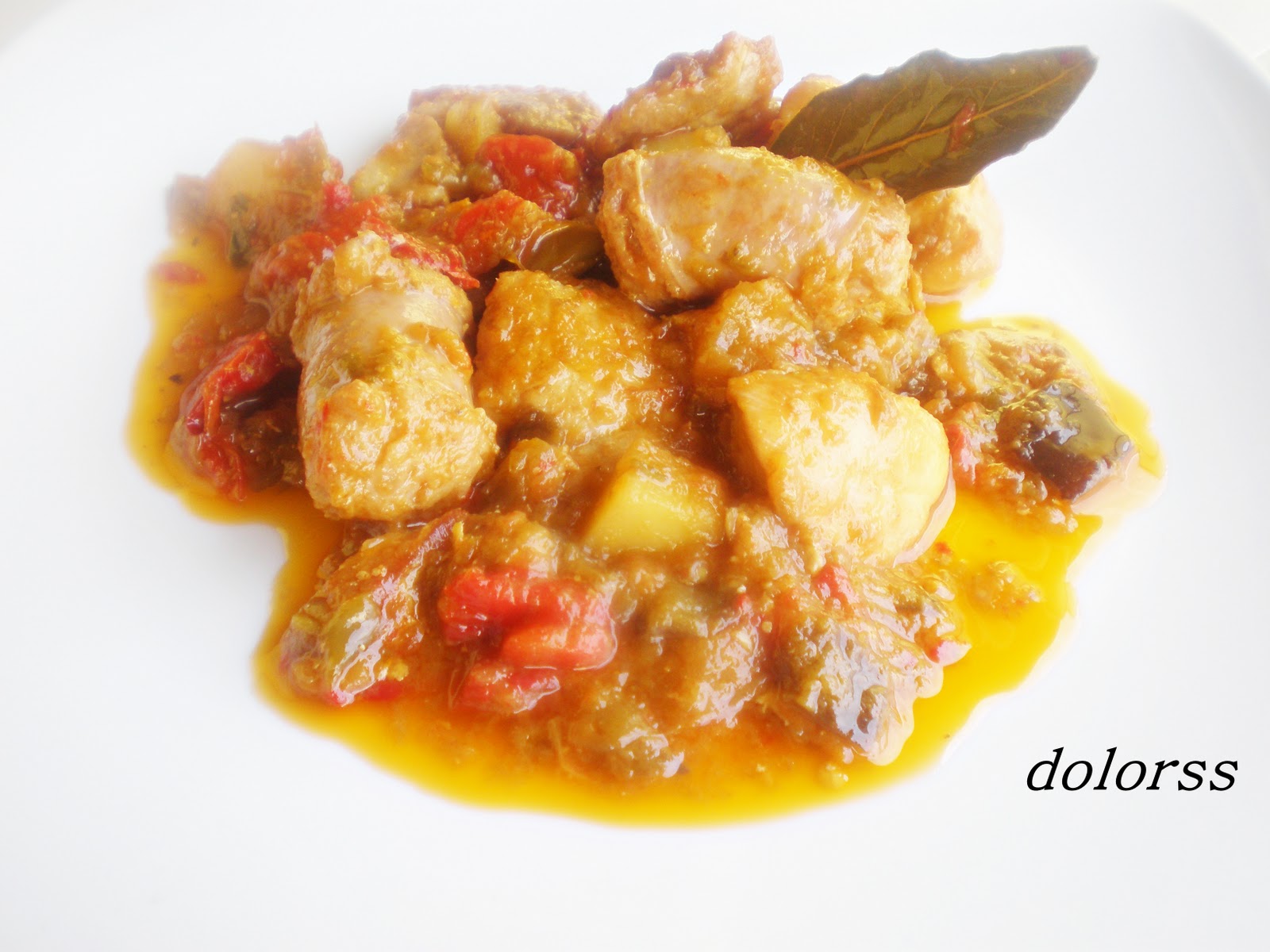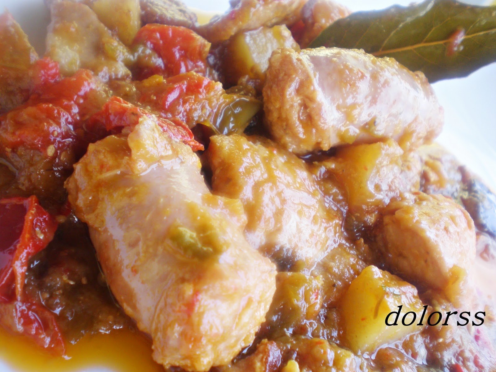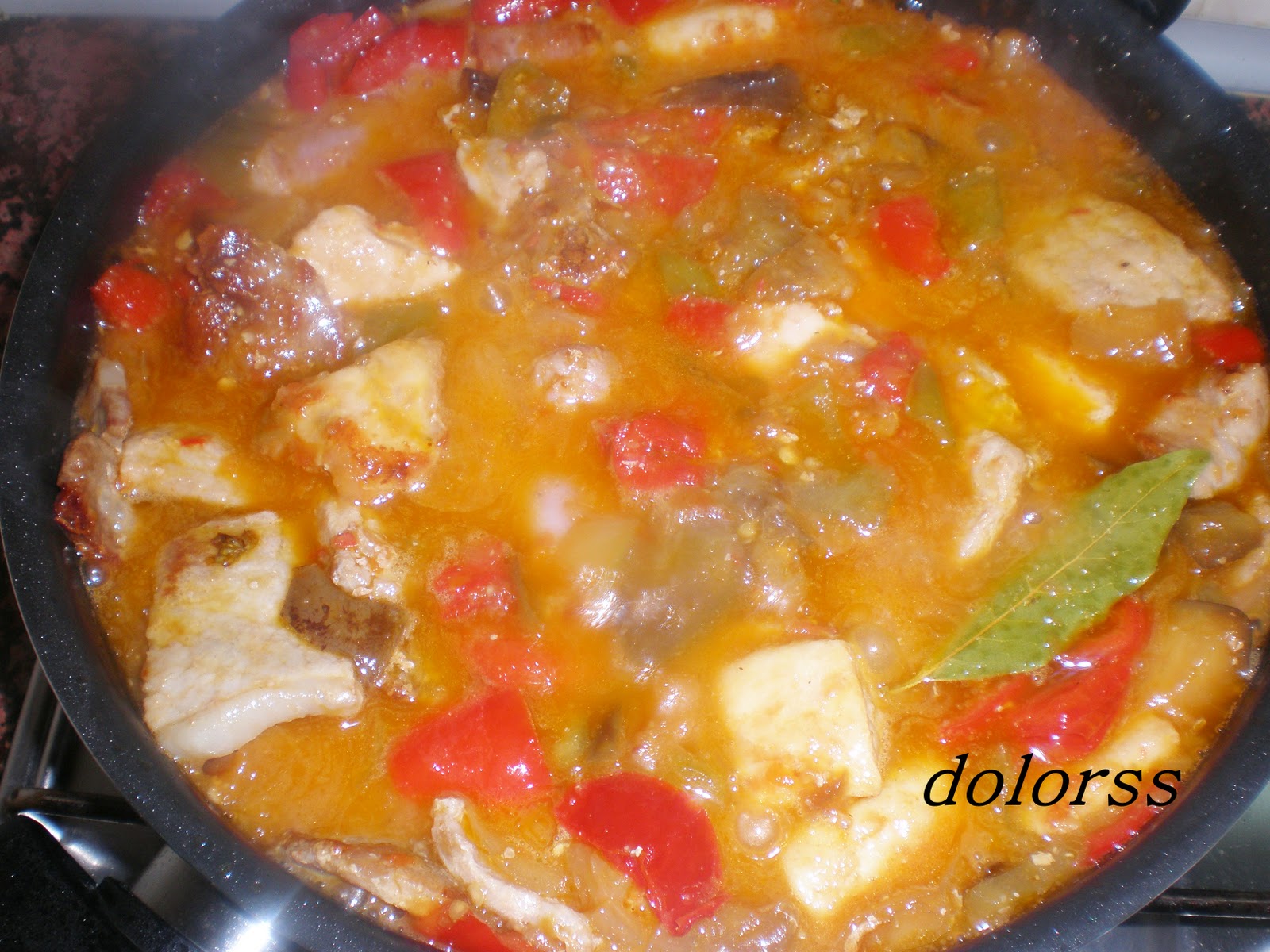 Ingredientes para 4 personas: 3 palmos de longaniza a trozos300 gr., de solomillo a tacos1 Pechuga de pollosanfaina fresca (aquí) 2 c/s de tomate sofrito3 patatas medianassal, pimientalaurel, oréganoun chorro de coñacaceite de oliva virgen extraSi no tenemos hecha la sanfaina será lo primero que haremos. (aquí)