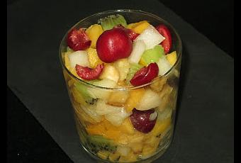 Ingredientes:- 2 kiwis.- 2 nectarinas.- 2 plátanos.- 2 rajas de melón.- Un puñado de cerezas.Elaboración:Simplemente lavar, pelar y cortar la fruta. La colocamos en un cuenco o vaso y listo para comer. Si queréis podéis dejarla un rato con azúcar para darle mayor dulzor, echarle algún licor o utilizar piña o melocotón en almíbar y añadirle este por encima.Revista Cocina