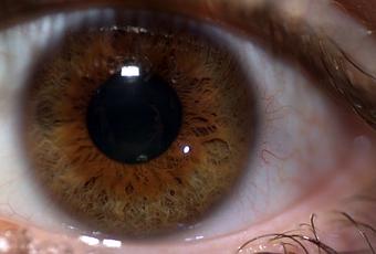 Fotografía sin dilatación pupilar. Se observan los vasos de la conjuntiva bulbar, membrana transparente sobre el blanco de ojo (esclera) y el tejido conectivo que forma la cara anterior del iris. También se aprecia el collarete y las criptas de Fuchs