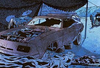 La busqueda y el armado del clasico y genial auto de Max, y un vistazo mas directo a personajes que salen luego en la pelicula como los Buzzards, esta especie de guerreros que se caracterizan por sus extrañas armaduras lenas de puas como sus autos.
