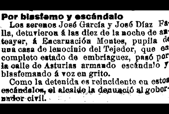Protagonista frecuente de escándalos, aparece en la prensa al menos dos veces más precisamente por esa causa. En El Principado del 2 de diciembre de 1909 se informa de que le han impuesto multa de cinco pesetas por haber promovido reyerta, alcohol mediante, con Romualdo Carbajal, Manuel Peña y Ramona Pérez, suponemos que clientes y compañera de profesión.