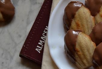 - Repartimos la masa en nuestros moldes con forma de concha, llenándolos unos 3/4 de su capacidad. Horneamos unos 15 min o hasta que comiencen a dorarse por los bordes. Dejamos enfriar. Fundimos el chocolate y bañamos las madeleines por un extremo. Las dejamos enfriar y listas para tomar.