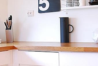Combinada con el blanco es como más me gusta. Creo que la sensación de calidez, limpieza y minimalismo es máxima. Si además añades una estantería String, no sabes si estás en la cocina o en tu dormitorio! Me encanta incorporar en las cocinas elementos que habitualmente usamos en otros lugares.