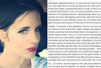 Terry escribió en su cuenta de la red social que estaba muy avergonzada por la actitud que había tenido su hijo con una niña nueva que llegó al colegio. Su hijo se había dedicado a acosar a la niña y ella estaba avergonzada porque el chico rompiera los zapatos nuevos de la niña y decide que