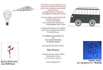 La noche del 19 de enero, en los Diablos Azules (Apodaca 6, Madrid), Álex Portero homenajea a Jack Kerouac a través de Mario Crespo y los nexos de unión entre la literatura de ambos. La entrada es gratuita y la editorial invita a tomar algo a todo aquel que compre un libro. Reunión, amigos, libros, noche... aviso con antelación para que les vayan reservando el día.