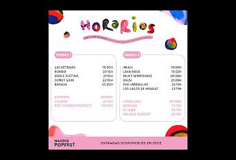 Ya está aquí el Madrid Pop Fest y tenemos los horarios, dos jornadas en la Sala Galileo Galilei donde vivir la mejor música.Ya está aquí el Madrid Pop Fest 2024, antes de que llegue tenemos los horarios.Este año, el Madrid Pop Fest se realizará entre el 1/3 y el 2/3 en Galileo Galilei, entre los confirmados están Las Retamas, Rombo, Doble Pletina, Comet Gain, Brenda, ¡Miau!, Lava Rosa, Milky Wimpshake, Dalsi, The Umbrellas Banda y Los lagos de Hinault son los artistsa confirmados para esta edición.