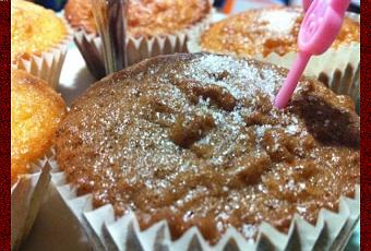 Removemos la masa, y añadimos con cuidado las almendras, la canela o la ralladura de naranja y vertemos en los moldes hasta 3/4 partes de su capacidad, añadiendo un poco de azúcar en grano por encima.