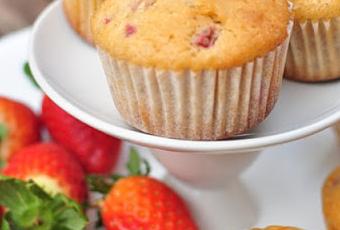 Pre-calentar el horno a 180ºC. Batir la mantequilla con el azúcar y la esencia hasta conseguir una crema homogénea. Incorporar los huevos, de uno en uno mientras seguimos batiendo. Mezclar la harina con la levadura y la sal e ir añadiéndola a la mezcla poco a poco y de forma alterna con la leche. No batir demasiado la mezcla cuando ya hemos añadido la harina, o saldrán las magdalenas mas duras. Por último agregar las fresas picadas y remover un poco para que se repartan bien por la crema.