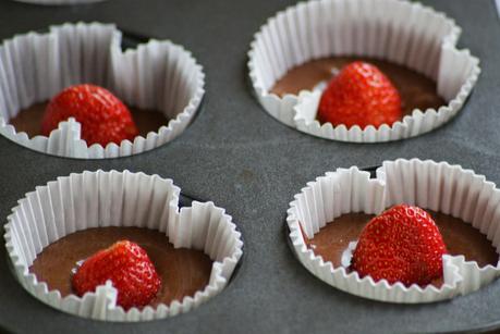 Los moldes rellenos con la masa y las fresas enteras, listos para el horno,jeje.