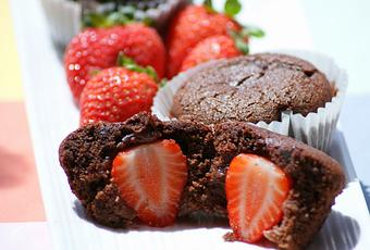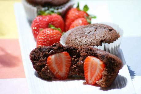 Primero, mezclamos en un bol la harina, levadura, cacao y sal, lo tamizamos y reservamos.Segundo, batimos los huevos y el azúcar dos minutos, pasado ese tiempo le añadimos el aceite y la leche, lo batimos un minuto más (que quede todo bien mezclado).Tercero, en un bol vamos poniendo las dos mezclas anteriores y tenemos que conseguir que quede con una textura libre de grumos. Ya tenemos la masa para las magdalenas.Cuarto, precalentamos el horno a 180ºC.Quinto,-en moldes para magdalenas- vamos llenando hasta más de la mitad de los mismos(2/3). En la mitad de los moldes ponemos fresa enteras(no ponemos en todos, porque hay varias formas de hacerlo, según las texturas que os detallaré después). Lo dejamos en el horno , 180ºC unos 15 minutos. Listos para comer.