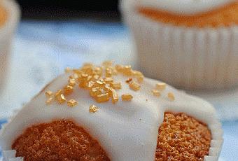 Repartimos el glaseado entre todas las magdalenas y las decoramos con los cristales de azúcar antes de que se endurezca.