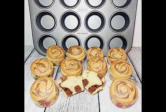 3.Calentamos el horno a 220 grados ,colocamos las cápsulas dentro de cada cavidad de nuestro molde y llenamos las cápsulas hasta 2/3 partes. Y con la manga pastelera inyectaremos un poco de la masa de chocolate unas 3 o 4 veces luego con un palillo largo moveremos un poco para hacer el efecto marmolado.