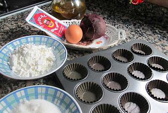- Harina de maíz 75 g.- Levadura química ½ sobre.- Azúcar 50 g.- Aceite de oliva suave 50 ml.- Huevos 1.- Remolacha cocida y triturada 100 g.