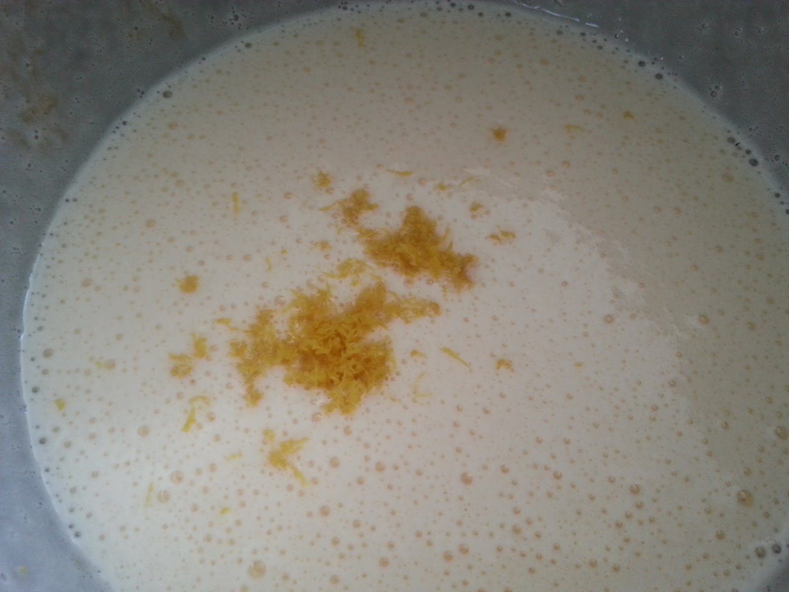 2. - Le añadimos el aceite, la nata y la ralladura de medio limón y volvemos a batir hasta que esté todo integrado.