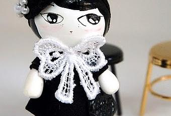 Mageritdoll se viste inspirandose en "Chanel", por ello luce el clásico furró negro, que adorna con un gran lazo de encaje veneciano blanco. Y como complementos lleva un canotier adornado con pequeñas perlitas en forma de flor, y un bolso inspirado en el clásico de "Chanel"