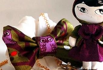 Y como en la tela aparecen búhos, que se pueden apreciar en el lazo de la cadena… para hacer un guiño a esa estampación, de la cadena cuelgan búhos que observan a la Caperucita perdida en el bosque…