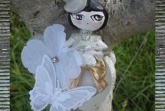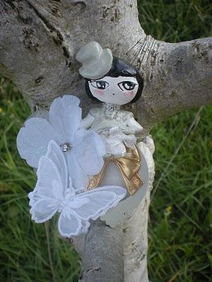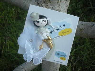 "Mageritdoll Colors" shabby chic se ha pintado y vestido especialmente para la fiesta de "Cerezas de tul". Para esta ocasión ha elegido un tono verde pastel y se acompaña de complementos blancos con strass y una gran lazada dorada.
