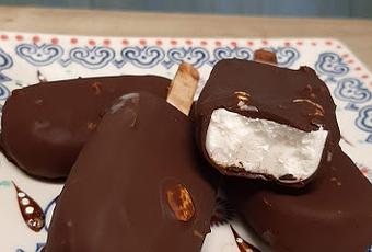 Desmoldar el helado, sumergir en el chocolate, sacar del chocolate y dejar que cuaje.