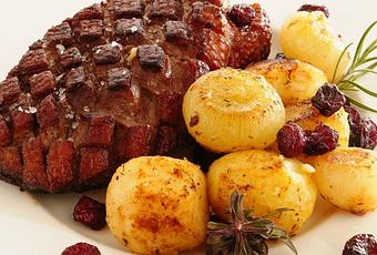 Sacar las patatas y las cebollas del agua de cocción y verter en la sartén dónde hemos cocinado el magret, añadir la grasa que haya soltado también la carne al escurrir, poner un poco de sal, un poco de pimienta y una pizca de tomillo, saltear hasta que se impregnen bien de la grasa y por último añadir unos arándanos deshidratados.
