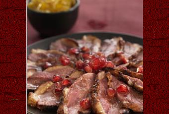 Ingredientes:•2 magrets •300 gr. de dados de mango •100 gr. de cebolla a la juliana •1 dosis de ajo troceado•100 gr. de azúcar •60 ml. de vinagre •1 cucharada de miel •1 granada •Sal y pimienta negra.Preparación:Deja descongelar los magrets de pato en una bandeja con rejilla para que los jugos de la descongelación queden aparte. Si quieres ir más rápido, también puedes sumergirlos en agua fría en su propio envase al vacío.