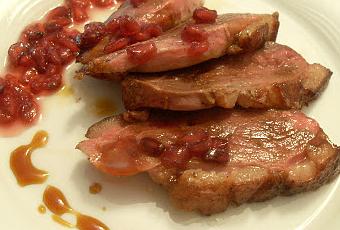 Cortar el magret en filetes de 1 cm. de ancho y servir la mitad en cada plato. Cubrir con un poco de salsa y repartir alrededor los granos de granada macerados.