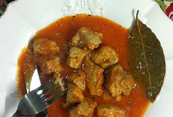 Este plato sencillo y económico que es un plato tradicional español, de Andalucía y Navarra, se puede elaborar de muy diversas maneras, pero lo que no falla es la utilización de carne magra de cerdo y tomate natural o de lata. Al cocinar la carne con una hortaliza ácida como el tomate se van soltando los jugos que dan lugar a un guisote exquisito que hay que acompañar con una buena barra de pan para mojar.