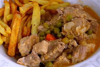 - Abrir, sacar las 2 patatas y batirlas junto con 1 tomate pelado, 1 cdta. de pimentón dulce, 2 dientes de ajo, 1 pastilla de caldo de carne o pollo y 1,5 vasitos de vino blanco. Añadir a la olla, junto con ¼ kg de guisantes congelados.