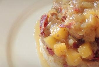 Con ayuda de un aro ponemos un poco del arroz cocido en el fondo y colocamos encima dos o tres cucharadas generosas de la carne encebollada con la manzana y regadas con su jugo.