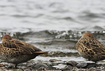 Descansando en las aguas someras de la orilla había una gaviota cocinera, un casal de cauquenes y otro de pato maicero (Anas georgica), que permanecieron bastante tolerantes a mi presencia; para aproximarme caminé lentamente y a una quincena de metros me agaché y fui avanzando muy lentamente para que los patos no se alarmaran; llegando a estar a unos 5 o 6 metros hasta que finalmente fueron al agua. Los patos estaban muy tranquilos dormitando, luego acicalándose hasta que finalmente por mi proximidad y algún movimiento que hice se fueron caminando lentamente al agua. Una vez en el agua y como permanecí quieto los patos se relajaron y comenzaron a buscar comida sobre la superficie del agua y también sumergiendo la cabeza y con el cuerpo en vertical, como es habitual en los patos que no se sumergen.