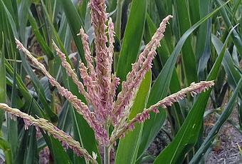 Hierba anual, robusta, cañas sólidas erguidas de hasta 3 metros de altura, con raíces adventicias en los nudos inferiores. Es nativa de Centroamérica. Se cultiva extensamente en toda la provincia de Buenos Aires y en casi todo el mundo. También es maleza en cultivos de siembra directa.