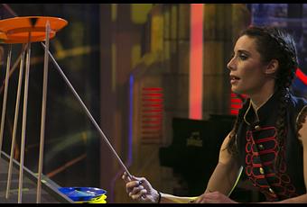 El malabarista va colocando más y más platitos sobre los extremos superiores de más y más palos. Y va dejando los palos enganchados por el extremo inferior en alguna muesca o base existente sobre la mesa.