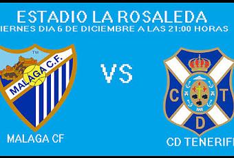 Este viernes día 6 de Diciembre el Málaga recibe en La Rosaleda a las 21:00 horas al CD Tenerife el equipo chicharrero no atraviesa su mejor momento y acaba de destituir al entrenador y viene con entrenador nuevo.Está en la clasificación por encima del Málaga pero con solo un punto más, el Tenerife aunque tenga un buen porcentaje de goles a favor 21 también tiene muchos en contra 24 por lo que se me antoja un equipo flojito en defensa, al que le crean muchas ocasiones.Ahora con un entrenador como baraja creo yo que será un equipo que quiera tener más el Balón, e intentara hacer un juego más equilibrado.El Málaga puede y debe aprovechar la incertidumbre que pueda presentar el rival al tener entrenador nuevo y salir a ganar el partido desde el principio, no nos valen medias tintas a estas alturas hay que gana si o si, para además de pasar al rival en la tabla, dar un paso adelante y no dejar escapar más puntos de la Rosaleda, pelear cada balón como si no hubiese un mañana.Y hacer que los tres puntos se queden en Málaga, y darle una alegría a la afición que ya toca
