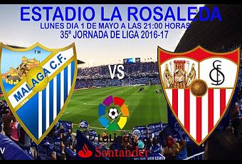 El lunes día 1 de Mayo juega el Málaga la 35ª jornada de liga 2016-17 y lo hace recibiendo al Sevilla fc en la Rosaleda a las 21:00 horas.