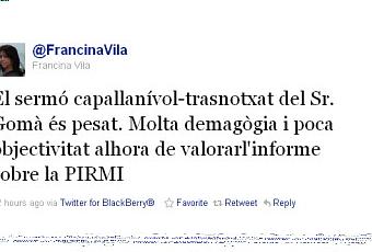 “La red la carga el diablo” van a terminar diciendo muchos políticos que han entrado en ella. La nueva regidora del distrito donde hasta hace unos meses yo era conseller de distrito, Francina Vila (CiU), tiene twitter. Algo loable si se utiliza como herramienta para expresar tus propias opinones fuera de la lógica de disciplina pura y dura e interactuar con los ciudadanos.