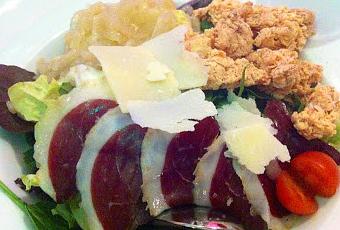 Evidentemente, no le hicimos caso, ("hombre, con lo delgadita que está la camarera, tres platos le parecerá mucho"), será que además de pereza, ese día andábamos con gula. Llegó la ensalada, de buena presencia, y con cuatro láminas de jamón de pato recién sacadas del sobre al vacio, un puñado de ensalada de nuestra querida amiga Florette (que cena/come casi siempre con nosotros), otro puñado de cebolla caramelizada, y unas bolitas de foie congeladas. Verdad verdadera, imposible morderlas, sin sentir ese frio helador en las muelas. Horrible.