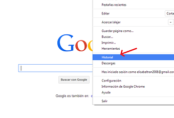 1. Abrimos Google Chrome y arriba a la derecha hacemos clic en opciones (el icono con las tres líneas)Luego pulsamos sobre Historial en el menú que se despliega.