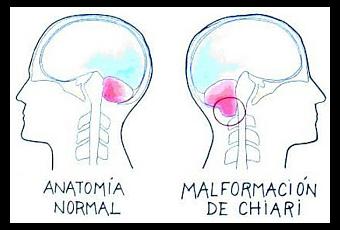 😅El Chiari es una malformación que viene del desarrollo en el embarazo; por resumir: el cráneo se forma más pequeño de lo normal y la parte de abajo del cerebro (cerebelo) desciende por el espacio que le pertenece al inicio de la columna (es una forma sencilla de explicarlo creo) de ahí que el liquido cefalorraquídeo (ese que va del cerebro a la columna y al revés) no pase bien, se presionen nervios y esta parte del cerebro no funcione del todo bien.