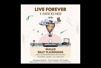 Antes de terminar el año encontraremos un directo muy especial con Mallo y Billy Flamingos en Moby Dick por el aniversario de Live Forever.La noche del 7/12 en la Sala Moby Dick de la mano de Live Forever que vivirá su X aniversario encontramos una fiesta sonora.