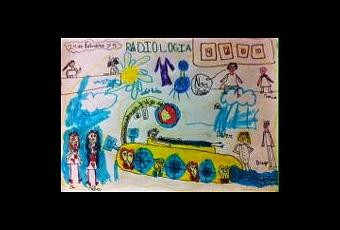 La mamá protagonista de este post y de esta historia, nos hizo al Servicio de Oncología Radioterápica del Hospital Universitario de Burgos un regalo "especial", pidiéndole a sus hijos de diferentes edades, que nos hicieran un dibujo acerca del tratamiento con radioterapia que estaba recibiendo su mamá. Es cierto que pone Radiología en lugar de Radioterapia, pues es fácil que los adultos confundan ambas especialidades médicas (espero que un día no muy lejano dejen de confundirnos). En el primer dibujo, se ve claramente un acelerador lineal pintado de amarillo y se dibuja con todo lujo de detalles al personal que de forma diaria trata a los pacientes: los técnicos de radioterapia y las enfermeras. El colorido y la expresión del personal son llamativos. La paciente (su mamá) aparece tumbada en la camilla sonriente, con un largo camisón y en actitud satisfecha.