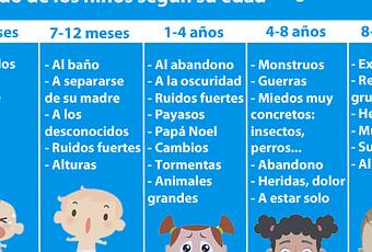 Los peques según crecen y se van desarrollando a nivel físico y mental son más sensibles a diferentes estímulos o ideas. He encontrado un artículo muy interesante en la web de Guía Infantil llamado “A qué tienen miedo los niños según su edad” que es super interesante porque va desglosando y explicando los diferentes miedos según las edades y además tiene un par de vídeos muy interesantes. En esta tabla lo resume genial: