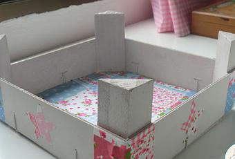 En definitiva, que protegí el suelo con un paño y allá que me tiré entusiasmada con mi idea. Como seca tan rápido le pude dar varias capas hasta tapar los rótulos de "Fresas de Huelva". Ya luego decoré las esquinas con las mismas telas adhesivas de la caja de gambas.