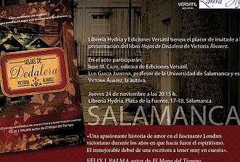 Más información: Presentación y firmas de Hojas de Dedalera con la presencia de la editora de Ediciones Versátil, Irene M. Calpe, el profesor de la Universidad de Salamanca y escritor, Luis García Jambrina, y la autora, Victoria Álvarez.
