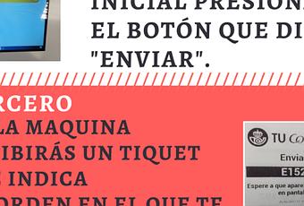 Para usar este apoyo solo hay que seguir los pasos y localizar los elementos de la imagen (apartado electrónico, pantalla que indica el orden, sensor de firmas, peso, etc…) en la oficina real a la que acudas.