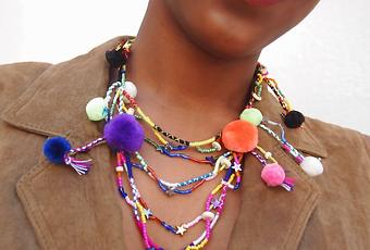 Ya os mostramos los bolsos, maxi bolsos y clutches de esta colección, ahora se ha hecho más grande con estos frescos y coloristas collares, muy fáciles de combinar con vuestras prendas de verano, con vestidos vaporosos, blusones y chalecos, o incluso con una sencilla camisa en denim.Son ligeros, con pompones y cordones de algodón y las estrellas y las diminutas cuentas de cristal les dan ese toque sofisticado, divertido y más que original.El estilo hindú está más de moda que nunca!!!!