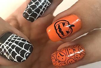 Para realizarla usé la base de Masglo Antidescamación. Luego como base para las estampaciones usé el Gótica de Masglo en tres uñas y en las otras dos el naranja de Leticia Well. Después apliqué en las primeras una estampación en blanco de una telaraña y en las naranjas estampé calabazas con esmaltes Konad y protegí todo con el top coat de Kiko.
