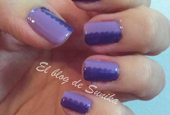 Yo escogí dos tonos de morado que me encantan. Se trata simplemente de pintar cada lado de la uña de uno de los tonos y una vez seco el esmalte con un dotting vamos haciendo puntitos con el esmalte más oscuro para que el resultado parezcan ondas.