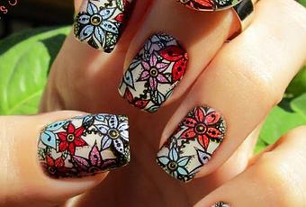 Como base usé un tono marfil y fui colocando las pegatinas casesas con este bonito diseño floral coloreado con esmaltes holográficos. ¡Me apetecía holo en mis uñas para mi Santo! 😊 ¿No me digáis que no lucen super bonitas las flores al sol?